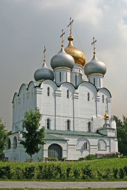 Главный собор монастыря – в честь Смоленской Иконы Божией Матери – был возведен в 1524-1525гг. и закончен к престольному празднику (28 июля). По некоторым данным, его приписывают работе Алевиза Нового, но другие исследователи полагают, что строил его зодчий Нестор, погибший при строительстве.