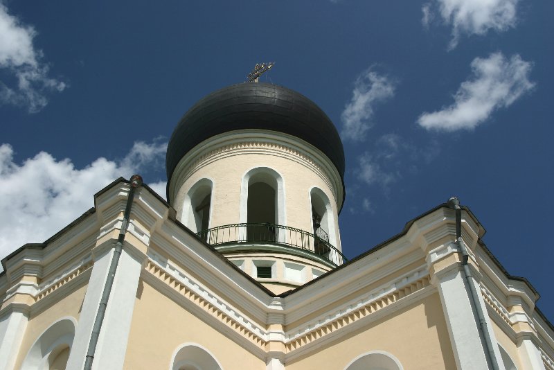 Храм необычен по своей архитектуре. Это высокий, в два яруса, основной объем, очень большой по площади и крестообразный в плене, который венчает массивный барабан. Алтарная часть храма – прямоугольная, а по бокам ее расположены низенькие полукруглые апсиды приделов.