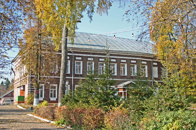 Напротив храма стоит двухэтажное здание, в котором