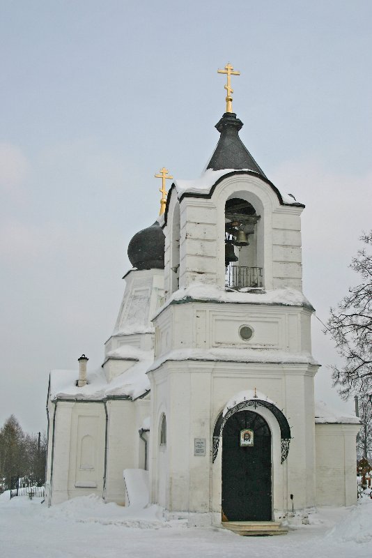 Двухъярусная колокольня, соединенная с церковью переходом, украшена несколько богаче – во втором ярусе сделана рустовка стен, маленький венчающий ее шатер окружен арочными завершениями проемов звона.