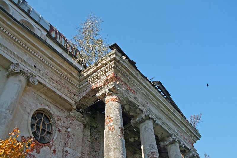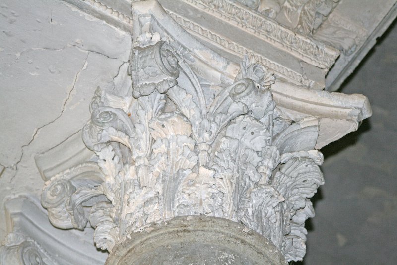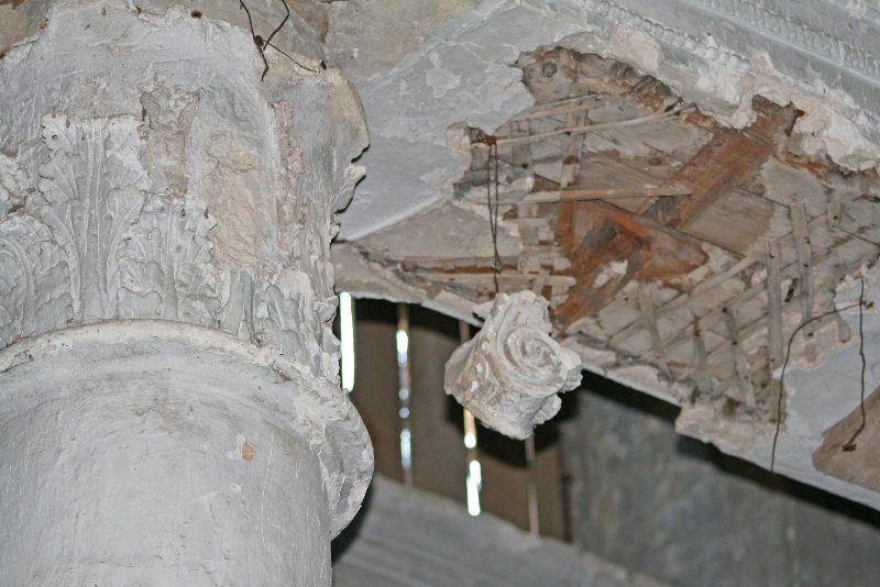 колонна, части лепнины свисают с потолка буквально на ниточках…