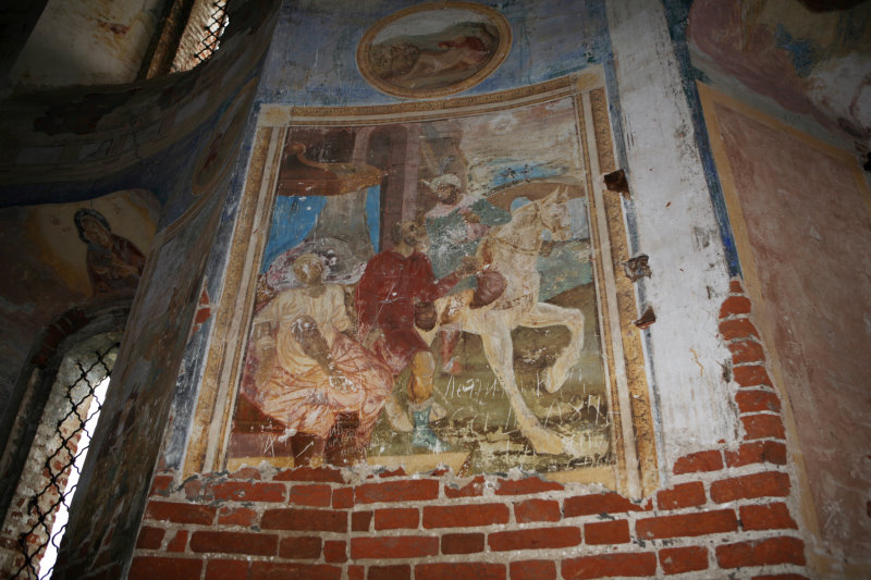 В советское время в великолепном храме устроили машинно-тракторную станцию. Чтобы внутрь могла проезжать сельскохозяйственная техника, расширили проем ворот. Выхлопы машин закоптили своды храма с фресками… К счастью, через несколько лет МТС вывели из храма, поэтому фрески сохранились и не скрылись под слоем гари и машинного масла.