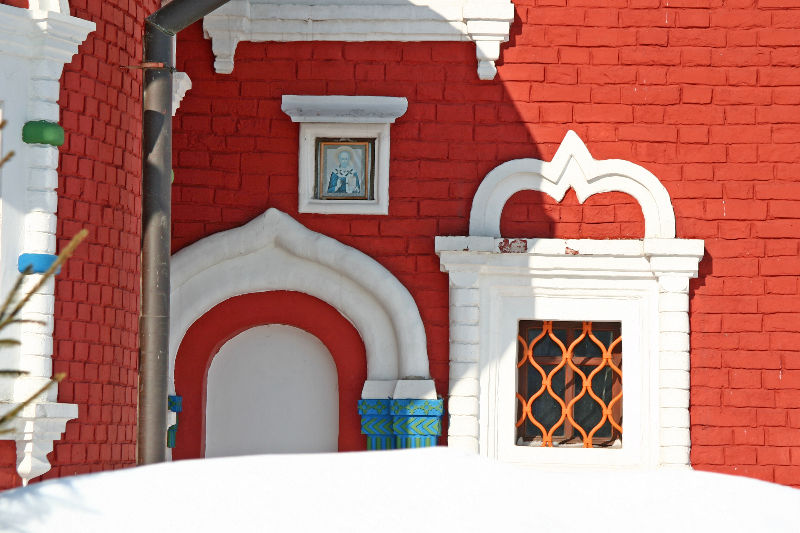 побеленные наличники и маленькие золотые купола на барабане четверика и